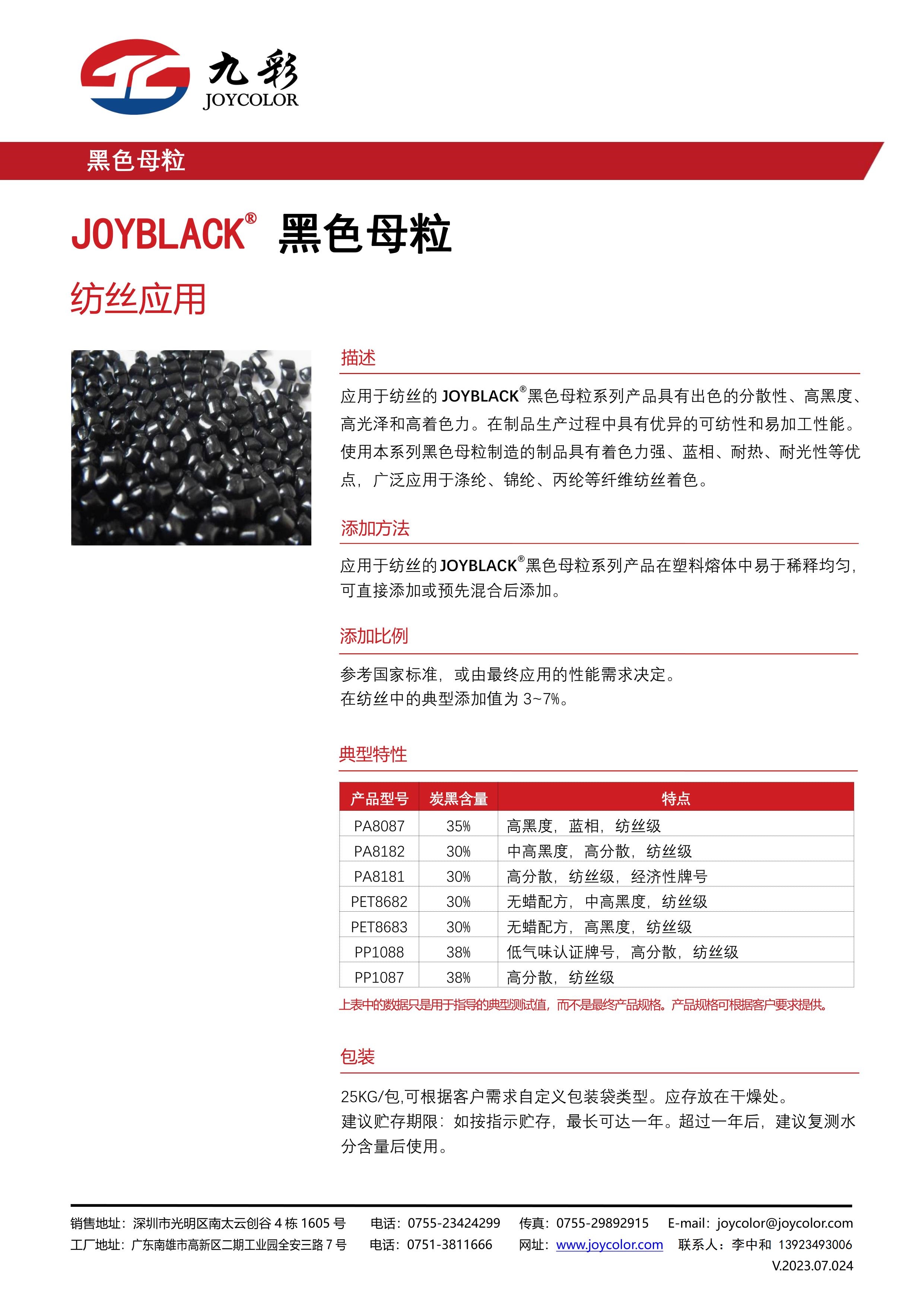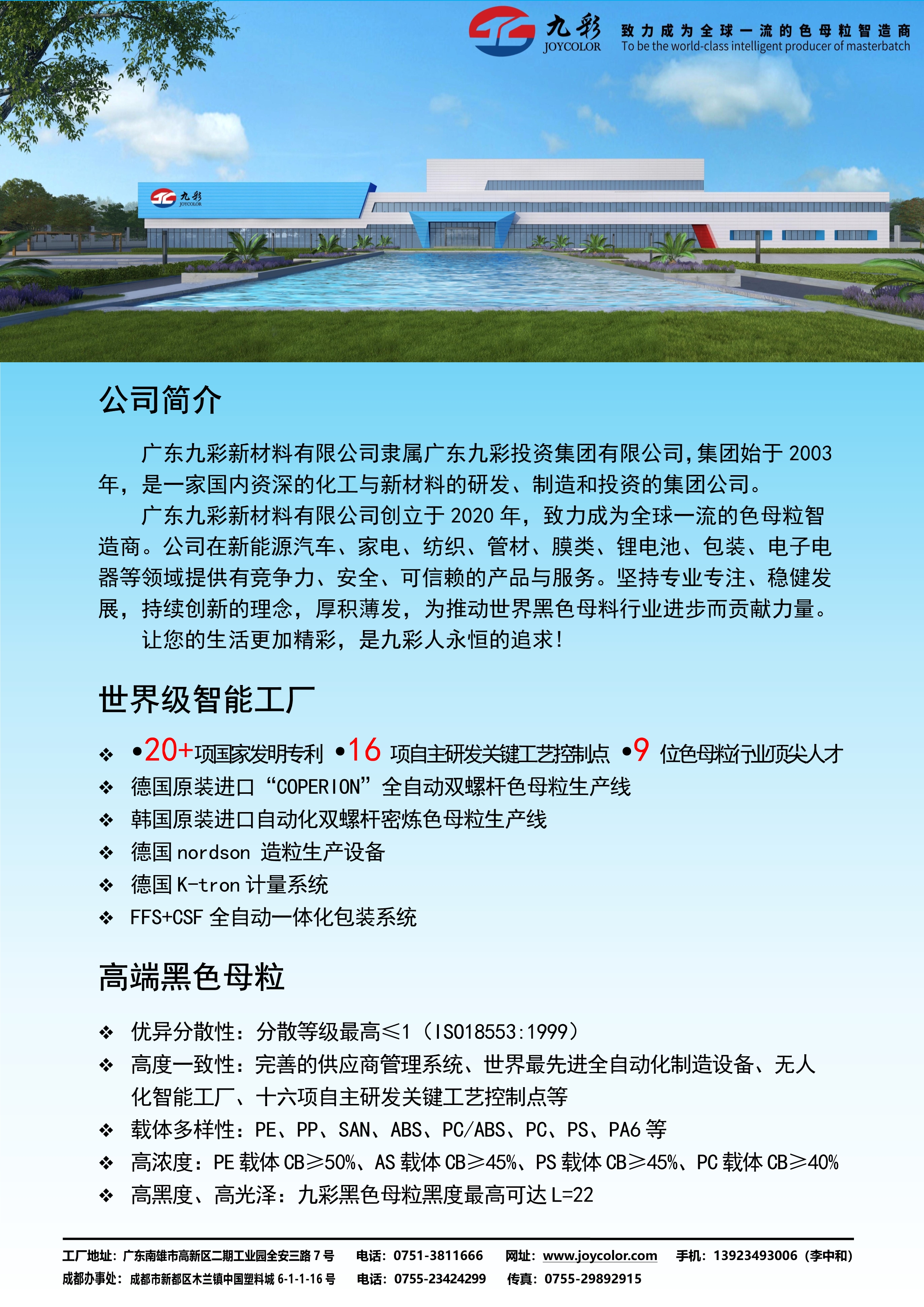 广东九彩新材料有限公司研发和生产AS、PA、PC、PE、PS、PP、PET、PBT、UN载体和无载体等系列高品质黑色母粒,具有炭黑含量高、黑度高、分散性好、光泽类型多、稳定性优异等优点,广泛用于染色改性和注塑、片材、板材、薄膜(农地膜、保护膜、土工膜、塑料袋)、管道、型材、纺丝、发泡等等。