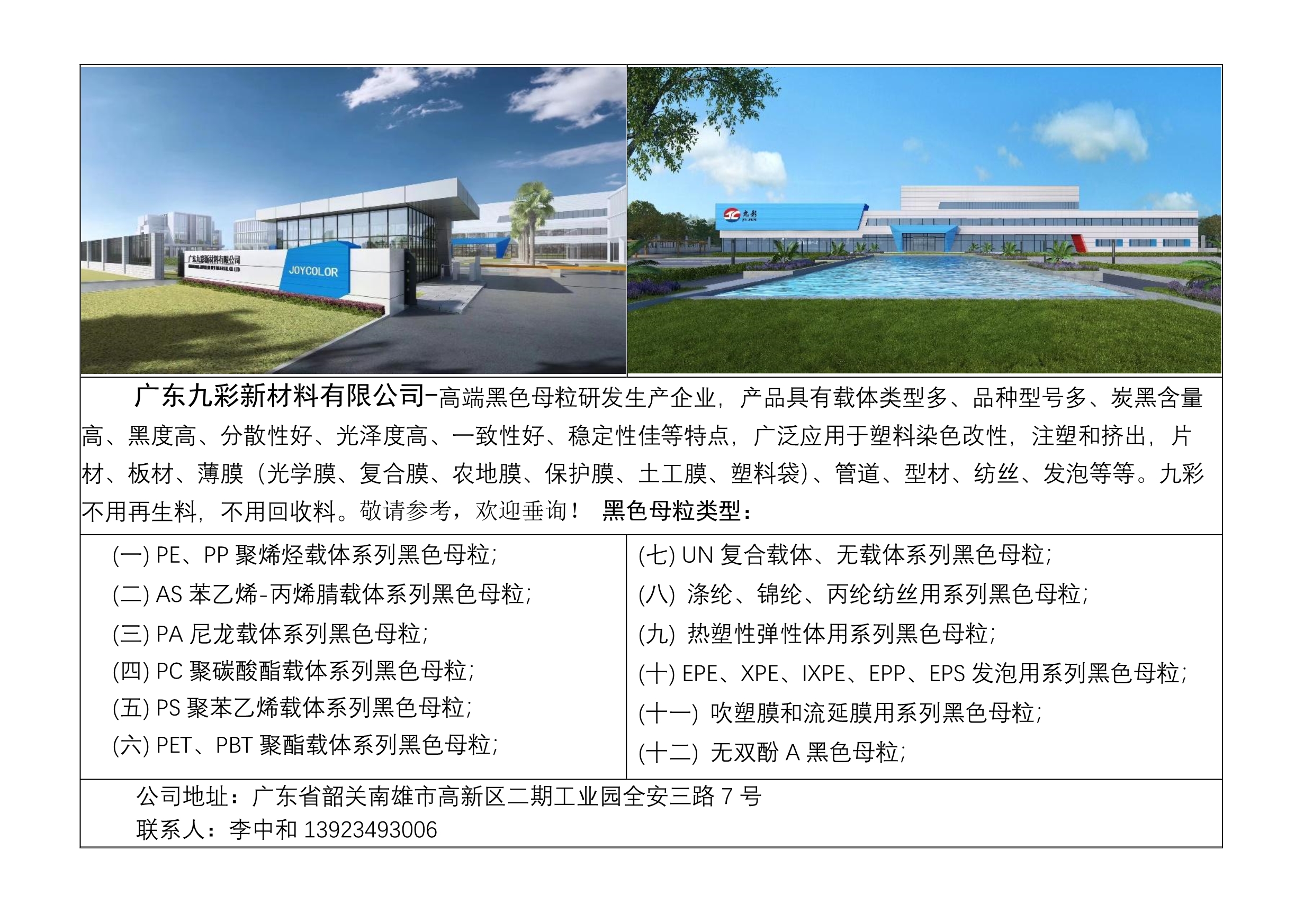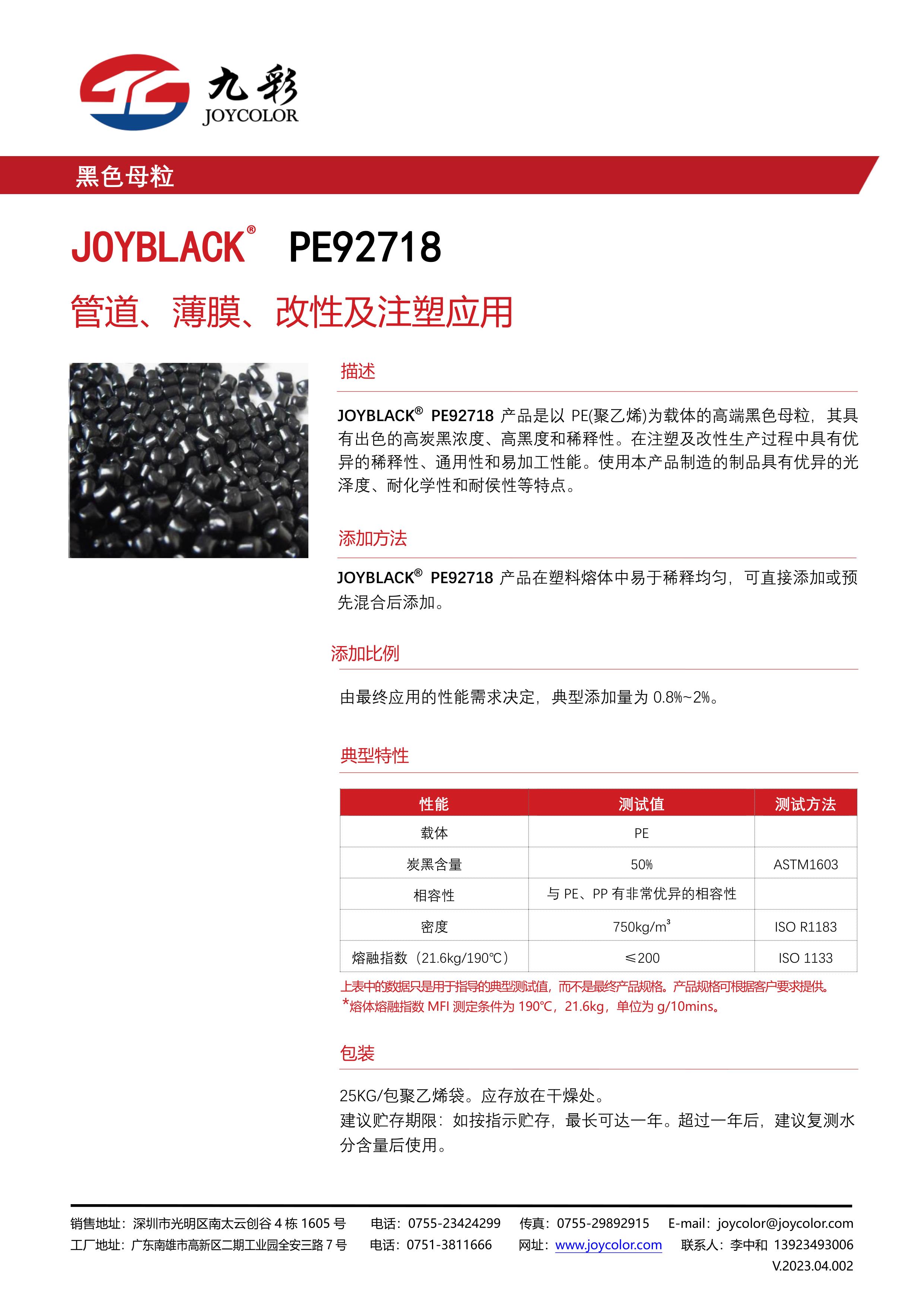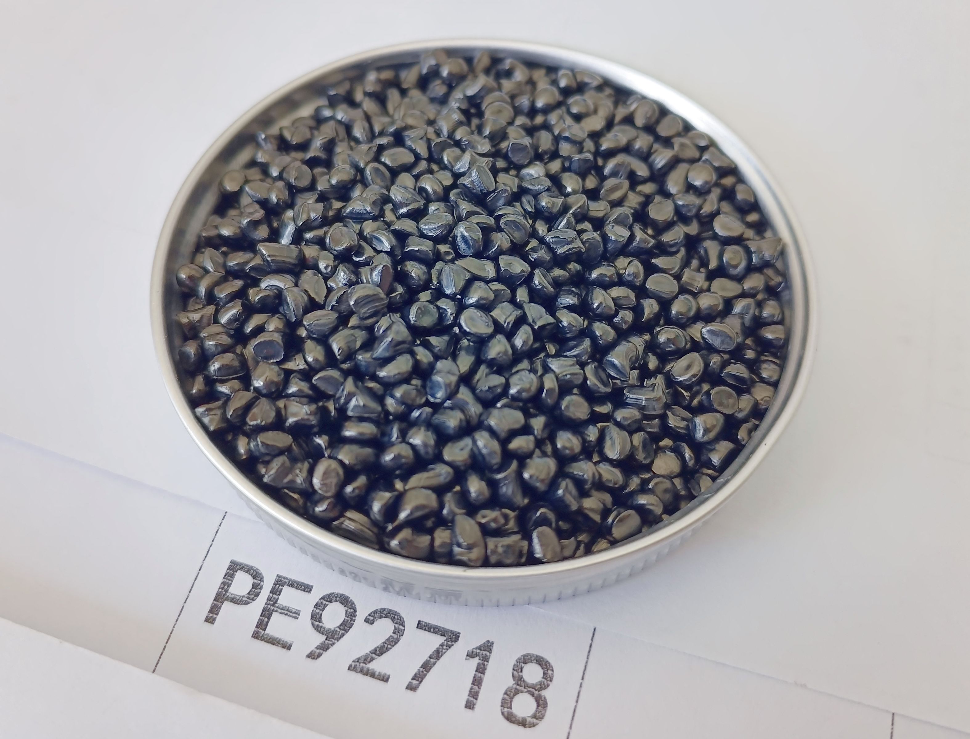 九彩新材料PE92718是一款通用性好的低气味中高熔指的聚乙烯载体黑色母粒。