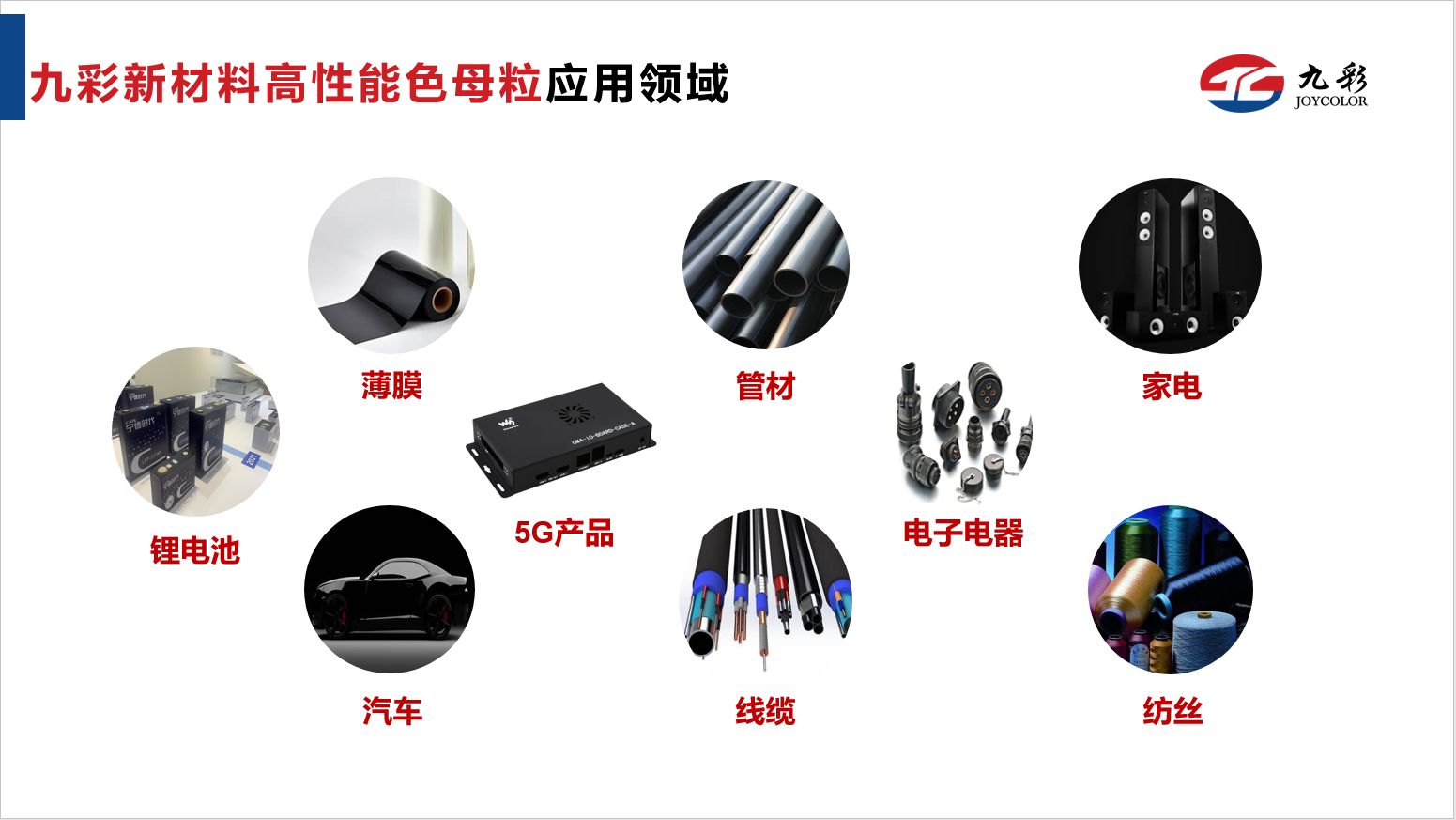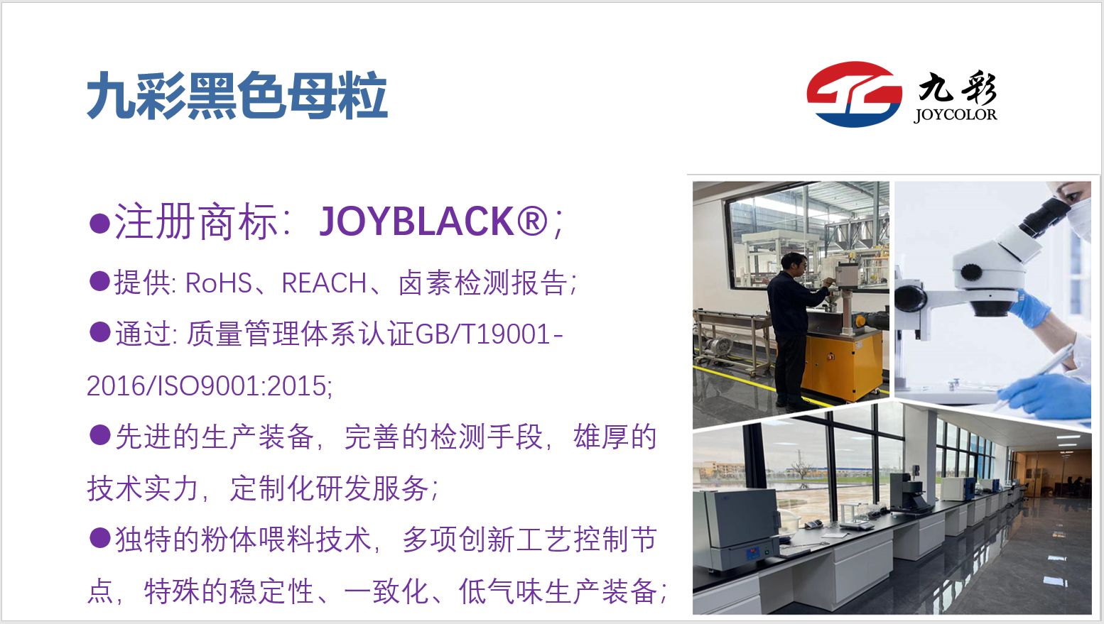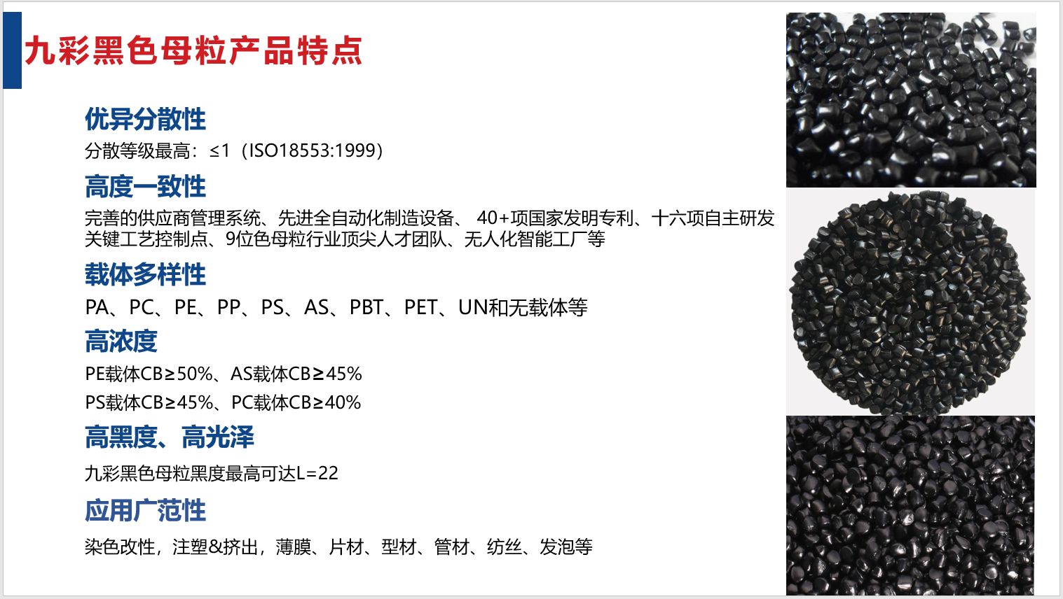 广东九彩新材料有限公司研发和生产AS、PA、PC、PE、PS、PP、PET、PBT、UN载体和无载体等系列高品质黑色母粒,具有炭黑含量高、黑度高、分散性好、光泽类型多、稳定性优异等优点,广泛用于染色改性和注塑、片材、板材、薄膜(农地膜、保护膜、土工膜、塑料袋)、管道、型材、纺丝、发泡等等制品领域。